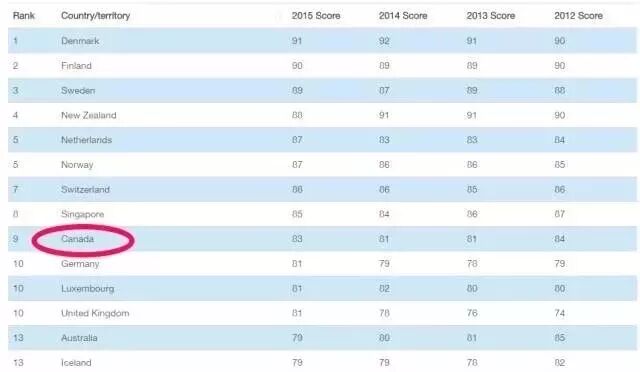 2015年,總部設在德國柏林的非政府組織透明國際(Transparency International)于1月27日公布2015最新年度全球清廉指數排行榜,加拿大再一次進入進入前十名,排在第9位。