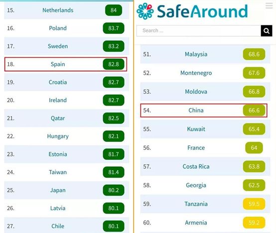 這里的環境安全不僅包括治安安全,還包括交通安全以及沒有恐怖襲擊和戰爭等各種威脅。根據國際安全水平評估網站Safearound發布的2019年數據,西班牙位列全球最安全國家第18位,而中國僅排名54名。