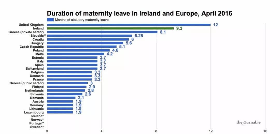 愛爾蘭孕婦可享受法定26周(6個(gè)半月)的超長(zhǎng)產(chǎn)假;產(chǎn)假長(zhǎng)度排歐盟第一,歐洲第二。