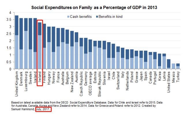 愛爾蘭政府對(duì)公民福利的支持不遺余力,根據(jù)2017年7月經(jīng)合組織(OECD)對(duì)各國(guó)家政府在“家庭福利”版塊的社會(huì)支出占國(guó)家GDP比例的調(diào)查統(tǒng)計(jì):愛爾蘭占比排名第6位,現(xiàn)金福利支出排名第3位。