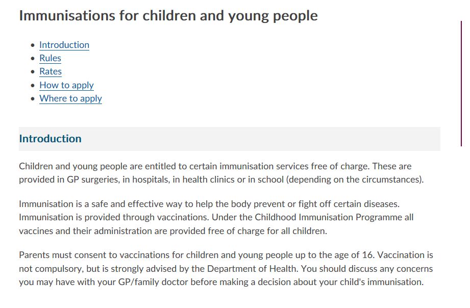 在愛爾蘭,孩子從出生直到16周歲,都能接受免費(fèi)的疫苗接種服務(wù)。愛爾蘭衛(wèi)生健康署(HSE)會(huì)詳細(xì)列出每個(gè)年齡階段孩子可免費(fèi)接種的疫苗,包括:卡介苗,脊灰疫苗(IPV),百白破疫苗(DTAP),乙型腦炎疫苗(JEV),麻風(fēng)腮疫苗(MMR),宮頸癌疫苗(HPV)等。